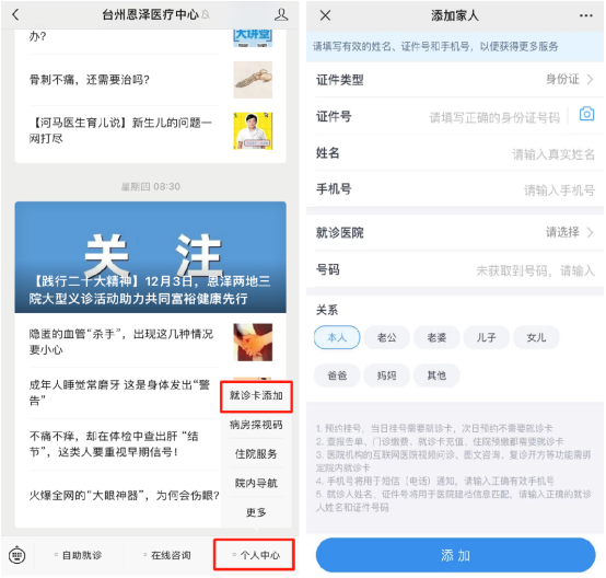 1、打开微信,搜索关注台州市恩泽医院的公众号(可在互联网医院清单上找到公众号名称),初次使用的患者,点击“个人中心”,选择“就诊卡添加”,通过姓名和身份证号码绑定个人信息(已添加过就诊卡可忽略此步骤)。
