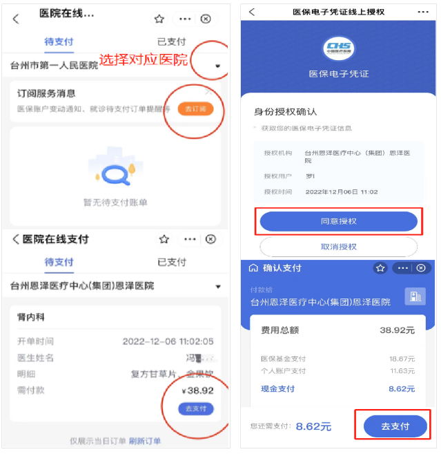 6、订阅服务消息,选择对应医院,查找订单点击“去支付”,同意医保电子凭证身份授权,然后即可进行医保移动支付。