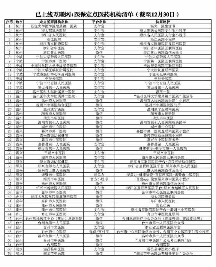 截至12月30日,浙江共有53家医院(其中宁波8家)开通“互联网+医保”诊疗服务,患者可通过支付宝、微信两个平台登录互联网医院就诊。