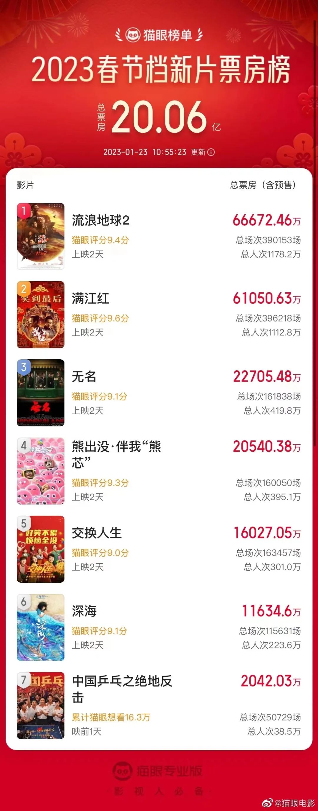 据猫眼专业版数据消息,1月23日10时55分,2023年春节档新片总票房破20亿!《流浪地球2》《满江红》《无名》分列票房榜前三位。