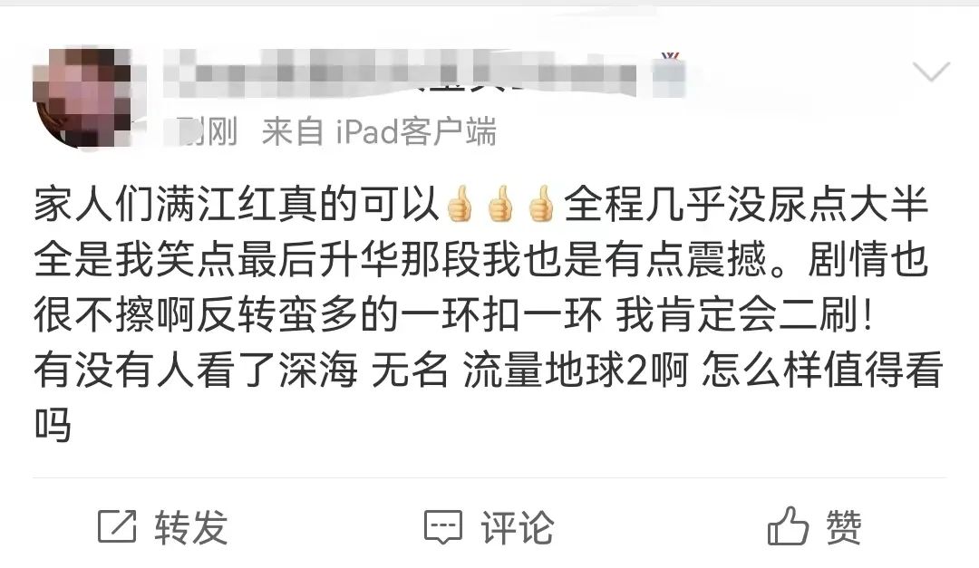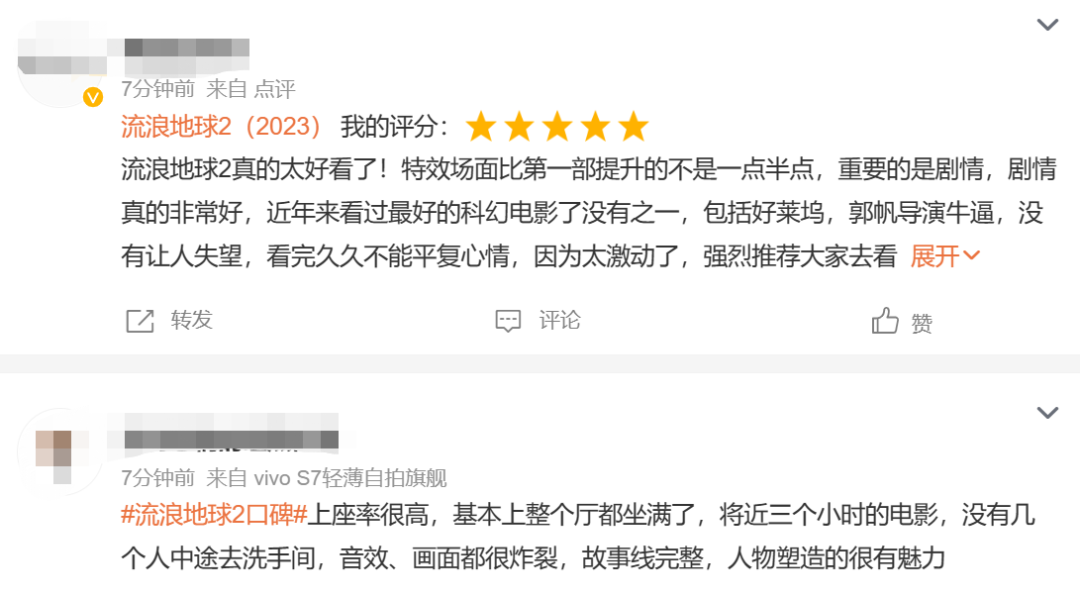 此外,领跑票房的《流浪地球2》也收获了不少来自网友的好评。