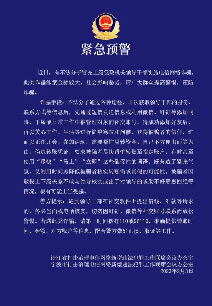 宁波公安预警!有人冒充上级党政机关领导干部实施电信网络诈骗
