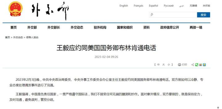 2023年2月3日晚,中共中央政治局委员、中央外事工作委员会办公室主任王毅应约同美国国务卿布林肯通电话。双方就如何以冷静、专业态度处理偶发事件进行了沟通。