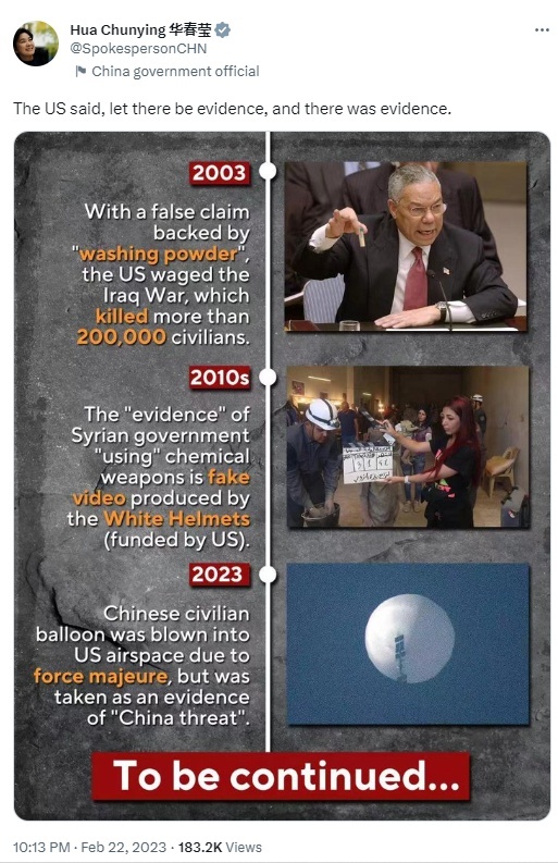 “美国说要有证据,这就是证据。”中国外交部部长助理、发言人华春莹22日在推特上发文晒图,讽刺美国在伊拉克问题、叙利亚问题、“气球”事件等问题上企图为自身行径找借口。↓