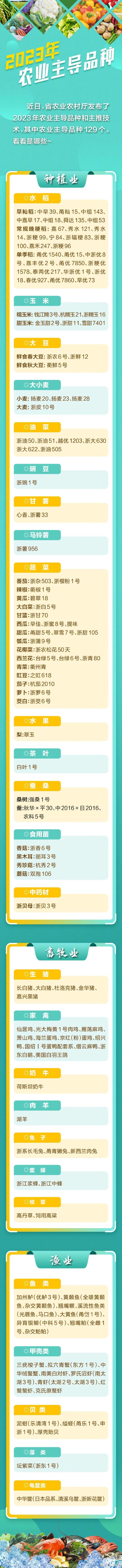 近日,省农业农村厅公布了2023年农业主导品种129个,其中,种植业主导品种84个,畜牧业主导品种25个,渔业主导品种20个,看看都有哪些。