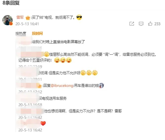 2020年,购买98英寸Redmi MAX 98的王先生安装电视时动用了吊车,在网络上引发关注。当时小米之家用了相关图片刊发了微博,雷军还评论“买了98"电视,就低调不了”。