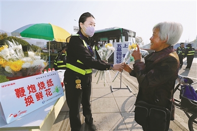 “一束鲜花献故人,文明祭扫靠大家。”昨日,宁波市公交集团镇海公司志愿者在九龙湖墓区公交短驳点通过鞭炮换菊花、文明祭祀承诺签名等形式向来往的扫墓客倡导文明祭扫,倡导市民过一个绿色、环保、平安的清明节。