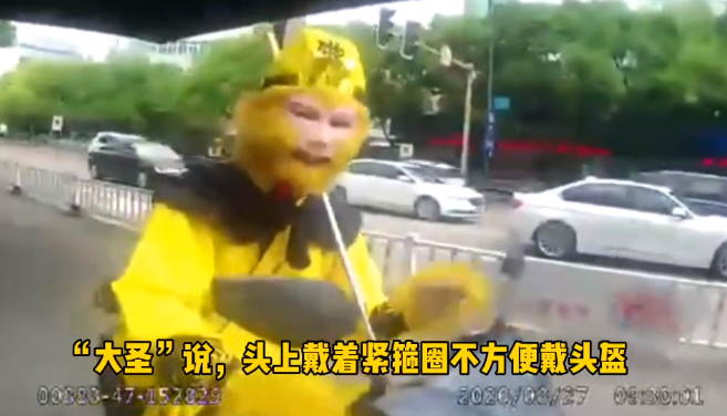 2020年8月27日上午,北仑交警在当地明州路与新大路路口查处电动自行车违法行为时,碰到了装扮成“齐天大圣孙悟空”的骑车人。只见“猴哥”头上戴着紧箍圈,肩膀上靠着一根金箍棒,骑着一辆小电驴,可就是没戴头盔。交警拦下“猴哥”,他有些不好意思,说头上戴着圈,不方便戴头盔。最后,在交警的教育下认识到了错误,并接受处罚。