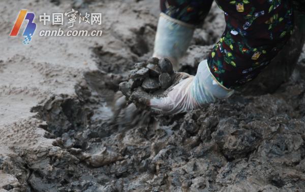 青蛤学名环文蛤,外壳呈黑白色。挖青蛤要趁小潮水,海水退去后,大片淤泥在塘里露出。农户挖着腰,以手当耙,从淤泥中挖出一只只青蛤,放进袋里。“青蛤长在淤泥表层,比较浅,比蛏子好挖多了”。