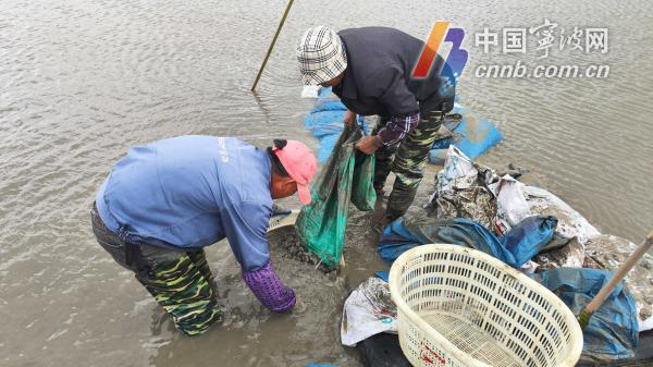 清明时节,地产海塘青蛤迎来收获季。今天上午,记者来到奉化裘村镇杨村的养殖区,农户应辉杰和老侯指挥几名工人,冒着细雨,在养殖塘里采挖青蛤。