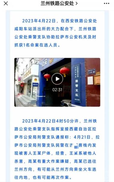 认证为“兰州铁路公安局兰州公安处”的微信公众号“兰州铁路公安处”4月26日发布的消息称:4月22日,兰州铁路警方协助拉萨警方及时抓获一名命案在逃人员。