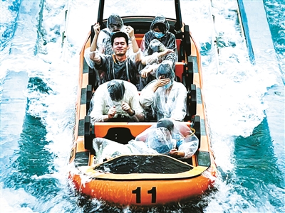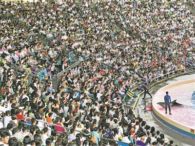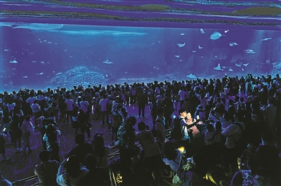 ⑥4月30日下午,一对游客正在珠海长隆海洋王国内的鲸鲨馆内自拍留影。(严子期摄)