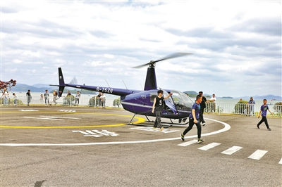 ⑧5月2日,游客在宁海湾景区峡山码头乘坐观光直升机,打算从空中观赏山海美景和奇特地貌。(李江林吴立高摄)