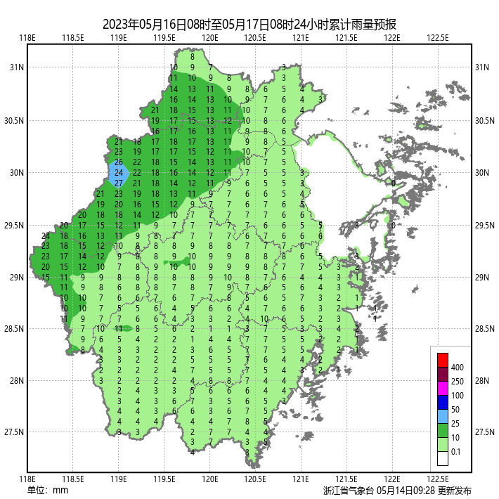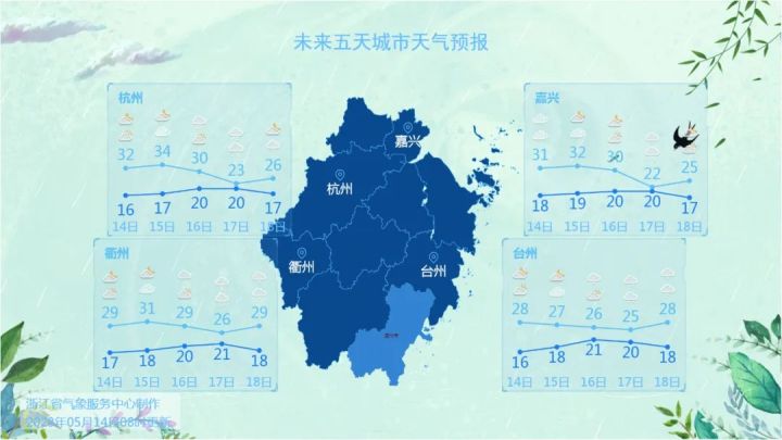 全省还有一次降水过程,从目前的天气形势图分析,降水主要集中在浙江的中南部地区。