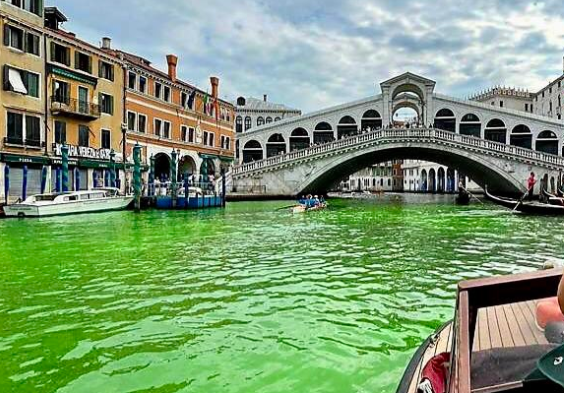 意大利威尼斯运河变荧光绿 警方和环保部门介入调查