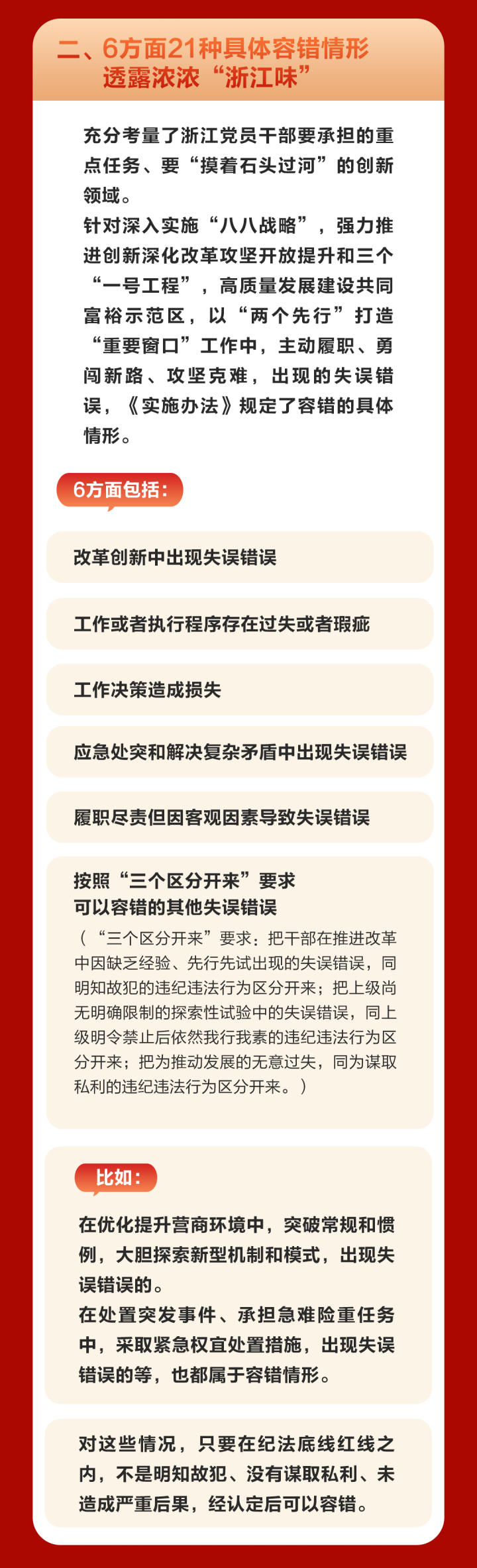 《实施办法》注重结合浙江实际,透露出浓浓的“浙江味”,充分考量了浙江党员干部要承担的重点任务、要“摸着石头过河”的创新领域。针对深入实施“八八战略”,强力推进创新深化改革攻坚开放提升和三个“一号工程”,高质量发展建设共同富裕示范区,以“两个先行”打造“重要窗口”工作中,主动履职、勇闯新路、攻坚克难,出现的失误错误,《实施办法》规定了容错的具体情形。