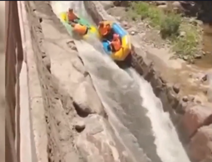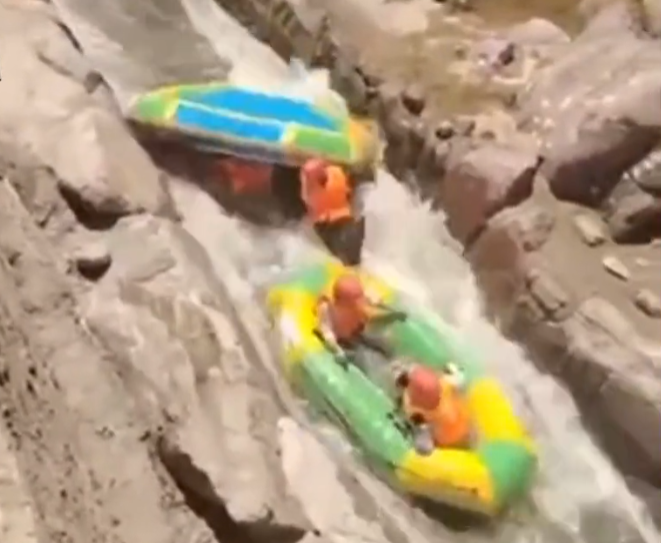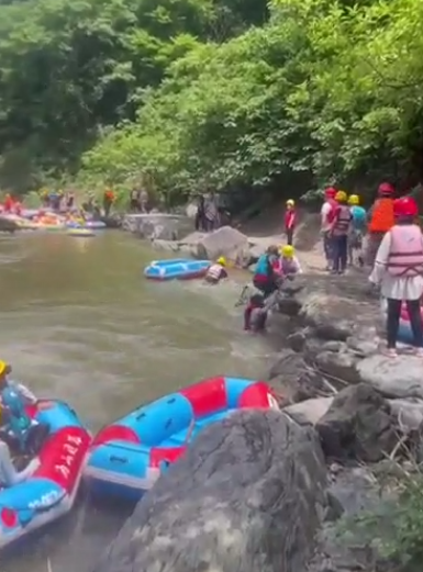 三门峡一景区游客在漂流时,被卡在漂流赛道,撞上前方的漂流船后,双双落水。