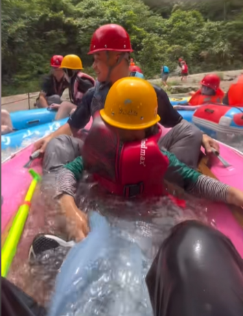 该漂流项目位于河南三门峡仰韶仙门山旅游景区。漂流船上的游客落水后,漂流船倒扣在两人头上。