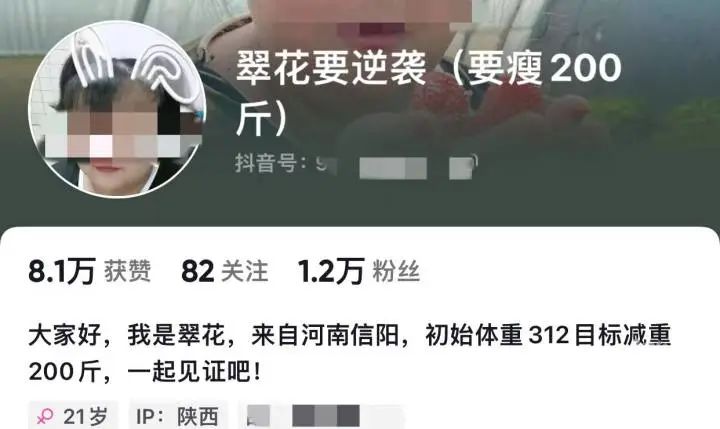 她开设了一个抖音账号名叫“翠花要逆袭(要瘦200斤)”(以下简称“翠花”),她去年体重为312斤,2022年9月份加入某减肥训练营,并且每天会更新视频,目标是减重200斤。