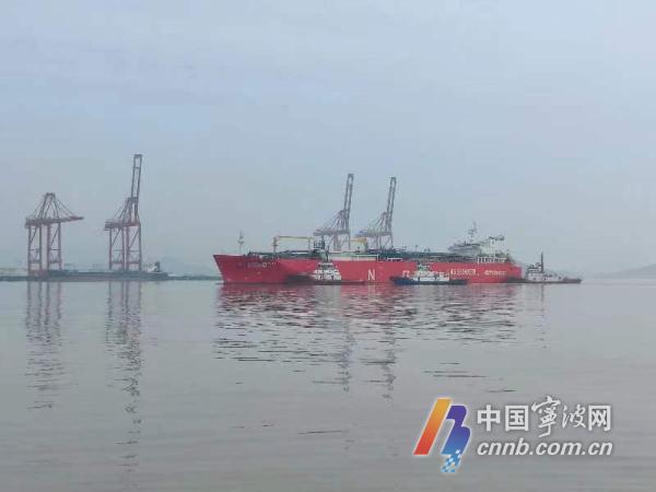 6月14日下午,在宁波梅山码头,全球最大的“海洋石油301”号液化天然气(LNG)加注船缓缓靠近马耳他籍国际航行船舶“达飞联合”轮。