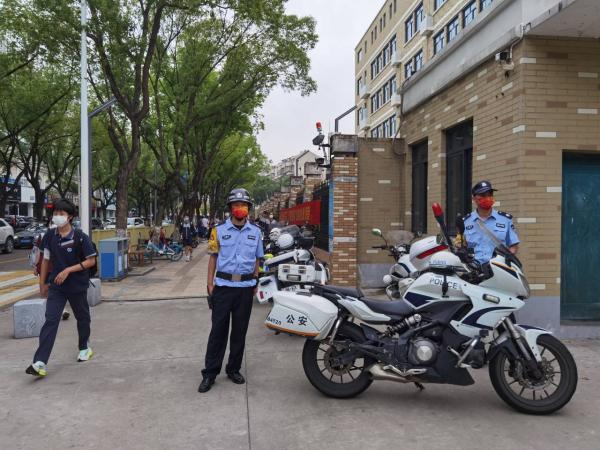 附近中河派出所的辅警为学生中考护航。(记者 沈莉萍 孔锡成)