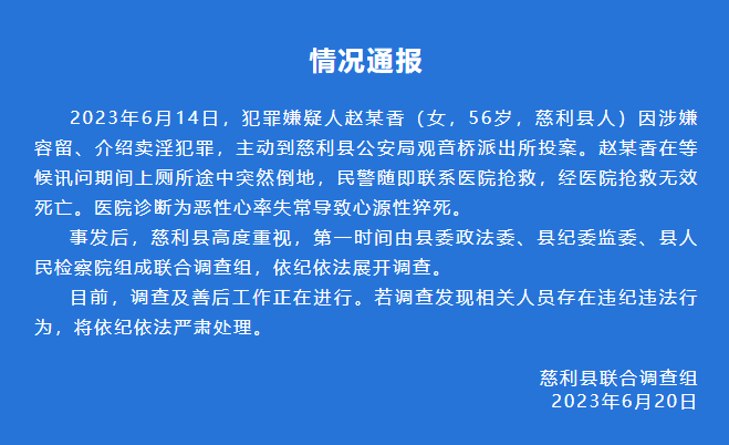 2023年6月14日,犯罪嫌疑人赵某香(女,56岁,慈利县人)因涉嫌容留、介绍卖淫犯罪,主动到慈利县公安局观音桥派出所投案。赵某香在等候讯问期间上厕所途中突然倒地,民警随即联系医院抢救,经医院抢救无效死亡。医院诊断为恶性心率失常导致心源性猝死。