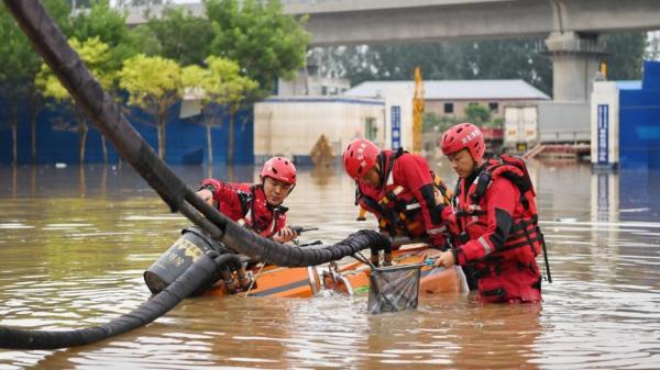 8月7日,唐山市消防救援支队队员在河北省涿州市市区内进行排涝作业。新华社 图