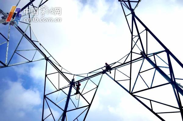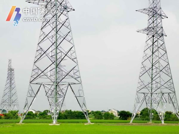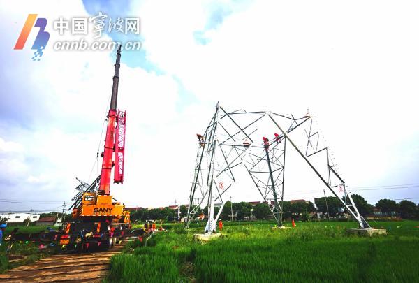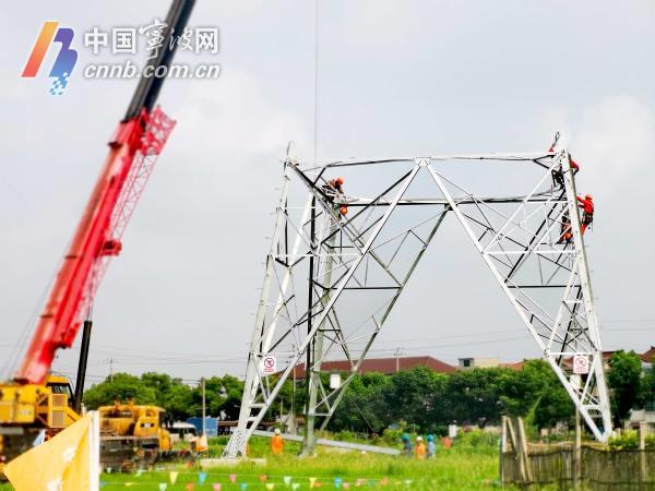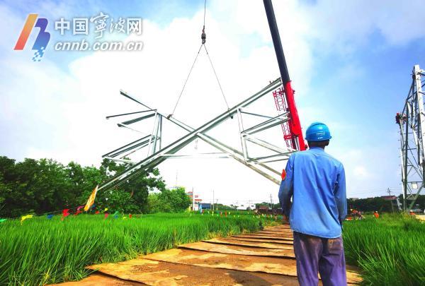 今天(8日)上午8时许,余姚市朗霞街道熊家街村的一处田间,高压输变电工程中的高压电塔安装工作正在有序进行。当日是"立秋"节气,电塔安装工人冒着高温,挥汗如雨在高空中安装高压电塔。