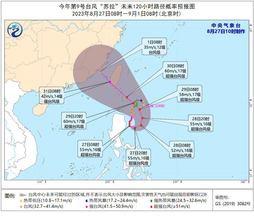 台风“苏拉”自生成后一直在海上徘徊加强,目前已是超强台风,预计其将继续转圈,29日开始向西北方向移动,逐渐趋向我国,并于31日白天进入台湾海峡。下周,台风“苏拉”可能会影响我国,但由于海上形势较为复杂,其动向还有很大不确定性。但不管以什么形式登陆,以“苏拉”的强度,它将带来大风和强降雨,地处台湾、福建、广东以及江浙沪的市民仍需密切关注台风动向,下周起逐步开始做好防台准备。