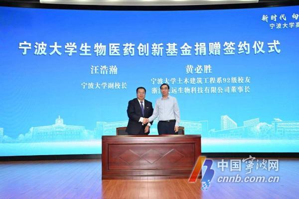 宁波大学土木建筑工程系92级校友,浙江天远生物科技有限公司董事长黄必胜先生捐赠1000万元人民币设立“宁波大学生物医药创新基金”,用于宁波大学在生物医药领域的建设与发展。