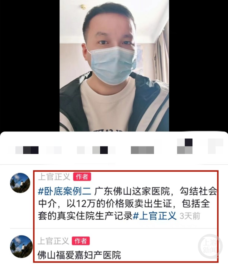 11月10日,打拐志愿者上官正义在其社交平台账号下指名道姓称“佛山福爱嘉妇产医院”。这条原发短视频发布时间为11月7日,文字内容为#卧底案例二 广东佛山这家医院,勾结社会中介,以12万的价格贩卖出生证,包括全套的真实住院生产记录#。