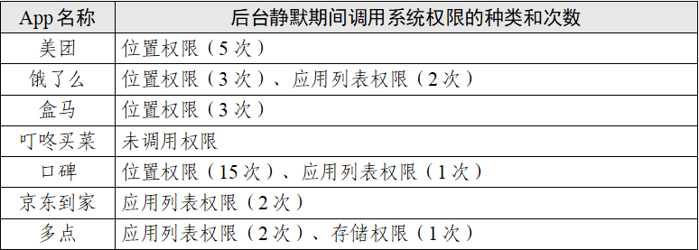 (5)在后台静默场景中,调用系统权限种类最多的为饿了么、口碑、多点(均为2类),调用系统权限次数最多的为口碑(16次)。具体情况如表6。