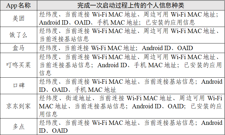 (5)在后台静默场景中,个人信息上传种类最多的为美团和盒马(均为2类)。具体情况如表11。
