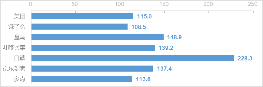 (1)7款App在用户完成一次外卖商品选购活动(启动App、浏览首页、搜索商品、选购商品)时,上传数据流量平均?³?最多的为口碑,约为228KB;平均最少的为饿了么,约为109KB。具体情况如图1。