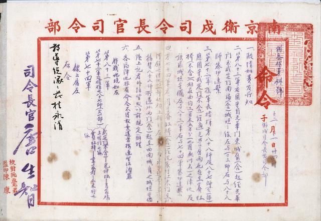 这是一份成文于1937年12月11日24时,有关“死守南京”的作战命令——“卫参作第44号”命令。该命令由当时南京卫戍司令长官唐生智向教导总队队长桂永清下达,右上方加盖有“南京卫戍司令长官关防”章。