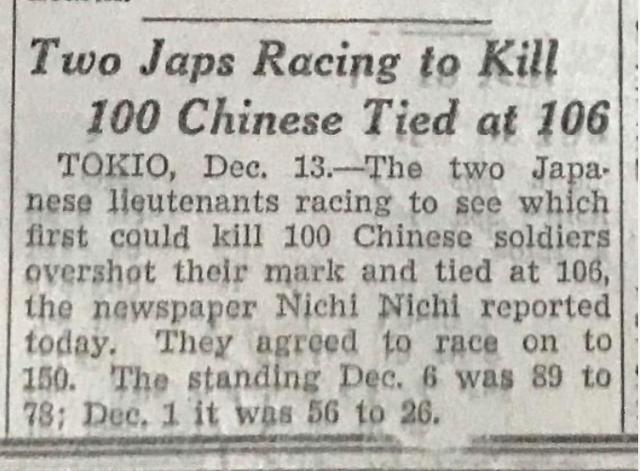“根据《东京日日新闻》报道,两名日本军官比赛看谁能先杀死100名中国士兵,结果都杀了超过100人,双方打平杀了106人,他们又同意重新比赛杀到150人为止,12月6日是89比78,12月1日是56比26。”这是1937年12月14日发行的《芝加哥每日论坛》中,一篇有关两名日本军官进行“百人斩”杀人竞赛的报道节选。