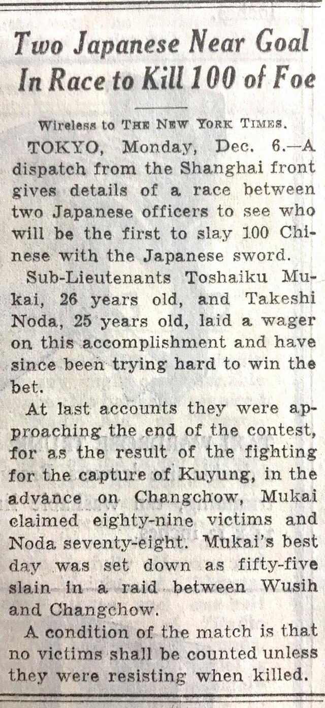 在1937年12月6日发行的《纽约时报》中,也登载了有关日军“百人斩”杀人竞赛的报道。报道称,来自上海前线的一份电报详细介绍了两名日本军官之间的一场比赛,看谁先杀死100名中国人。年纪分别为25岁和26岁的日本军官把赌注压在了这项“成就”上。
