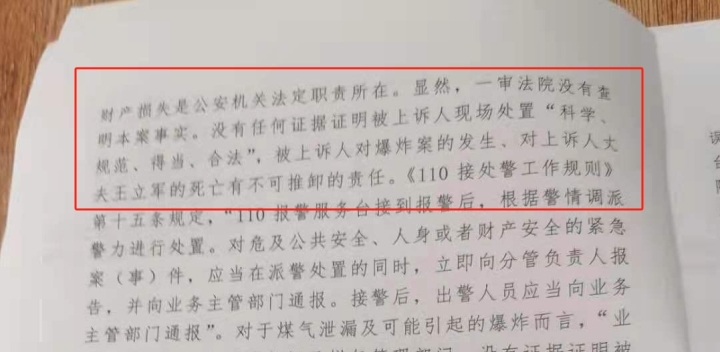 一审判决后,王艳丽提出上诉。二审期间,王艳丽认为法院没有查明本案事实,也没有任何证据证明被上诉人现场处置“科学、规范、得当、合法”,为此她向法院提交了《申请法院调查取证申请书》,申请法院调取“6·19爆炸案事故调查报告”。王艳丽回忆,警方在回答法官问话时承认存在多部门签发的事故调查报告,并承诺庭后一周之内提供,“他们不给,跟他们要就说没有。”时至今日,王艳丽仍未看到这份调查报告。