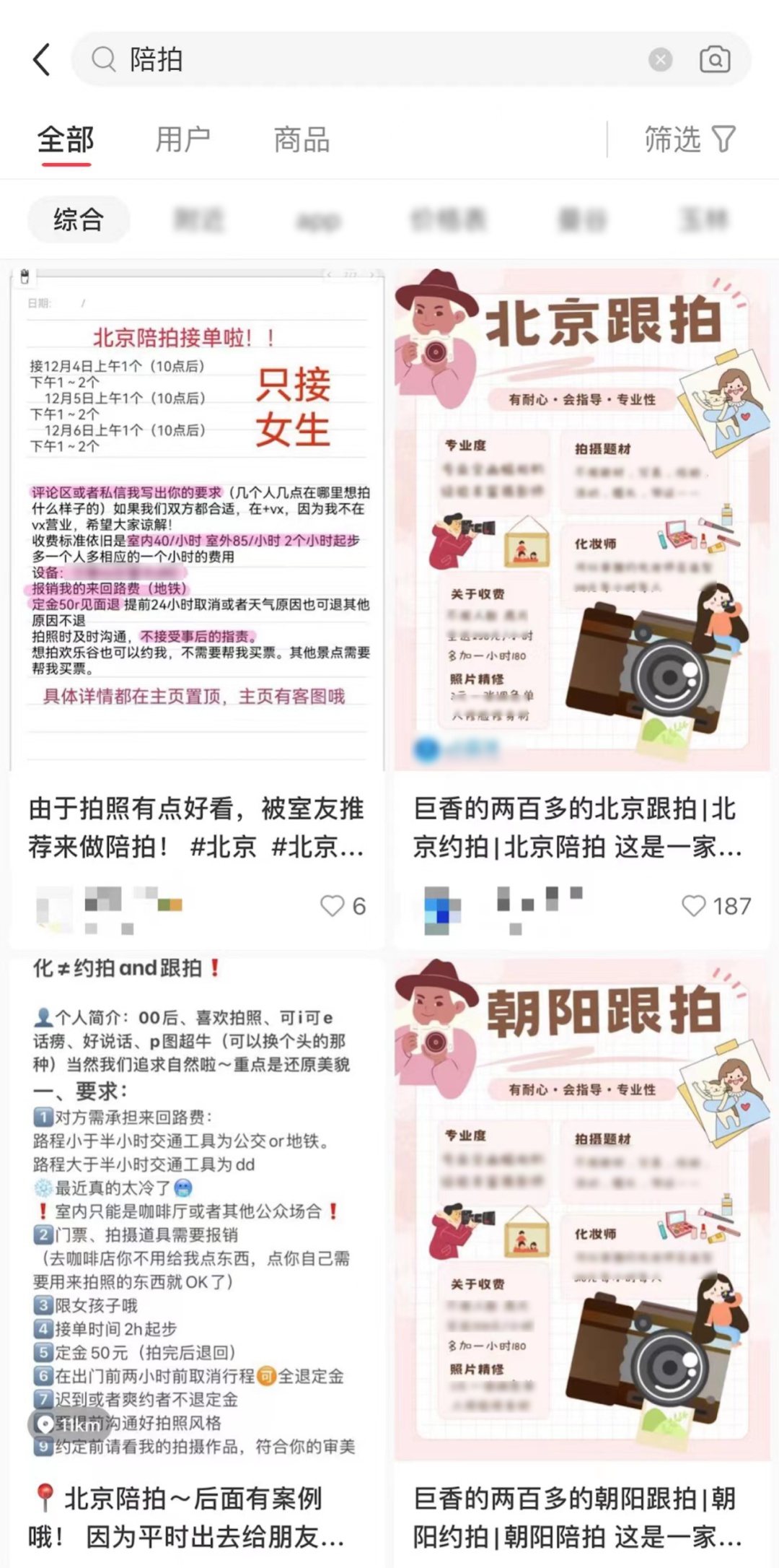 昨天(8日),记者在社交平台上以“陪拍”为关键词搜索发现,发布陪拍信息的以学生或者摄影爱好者居多,价格从几十元到一百元不等,“平价低门槛”成了陪拍的标签。