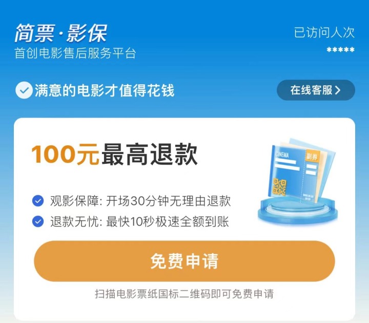 据介绍,该服务来自于北京简票影业,用户需要使用“简票影保”的小程序,通过扫描电影票正面的二维码,获得退款核销码后,再对准影院自助检/退票机扫描口完成复核,就可以完成退款流程。