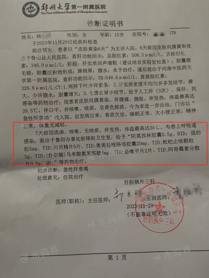 据多家媒体报道,2023年11月,15岁女孩小哲(化名)发现自己感冒,就在家附近诊所开了5天的感冒药带到学校。但小哲在服用感冒药后,同学发现她开始出现眼黄、手黄的情况。之后,小哲在爷爷陪同下,辗转两家医院后,于2023年11月29日转入郑州大学第一附属医院,后被诊断为“急性肝衰竭”。