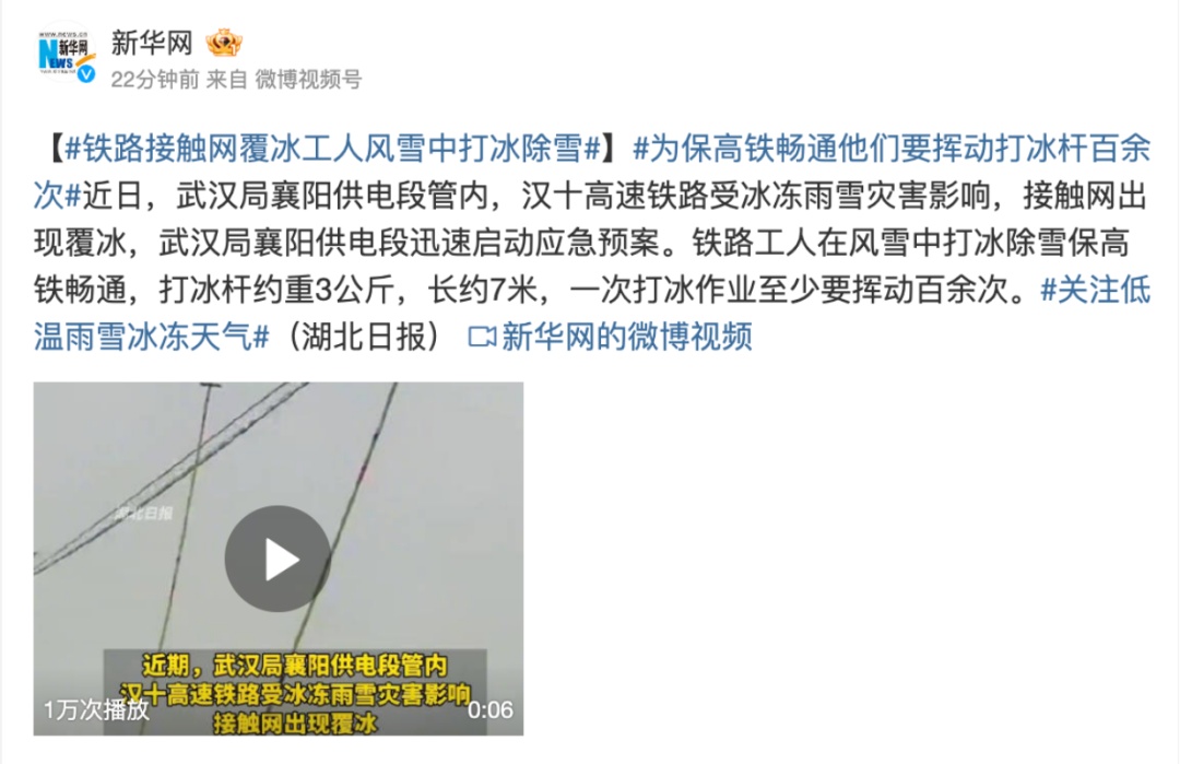 在铁路工人的辛勤付出下,道岔结冰的问题很快被解决。但高铁依然面临另一个更棘手的问题——接触网覆冰。