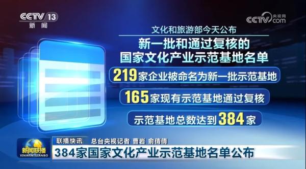 3月26日,全国文化和旅游产业发展工作会议在浙江宁波召开,文化和旅游部公布了219家企业为新一批国家文化产业示范基地,确定165家示范基地通过复核,保留命名。至此,国家文化产业示范基地达到384家。