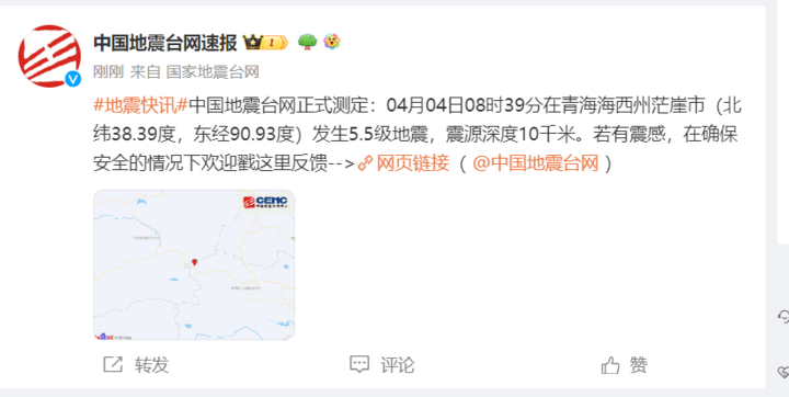 中国地震台网正式测定:04月04日08时39分在青海海西州茫崖市(北纬38.39度,东经90.93度)发生5.5级地震,震源深度10千米。