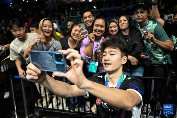 王昶(前)在今年马来西亚羽毛球公开赛后与观众合影。 图片来源:新华社