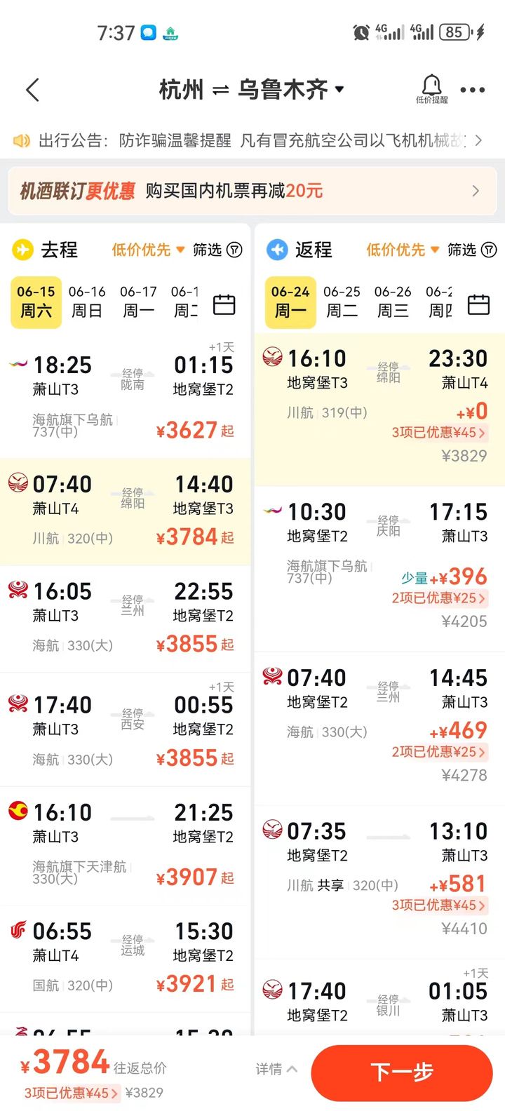 “四月底的时候就查过一次杭州飞乌鲁木齐的机票价格,当时1200元就可以买到一张6月8日出发的单程机票,到5月底再看的时候,相同的航班含税价格已经上涨到了2000多元,几乎翻了一倍。” 张女士说,由于杭州没有飞阿勒泰的直达航班,这意味着如果想要从乌鲁木齐直飞阿勒泰,还要再加购600多元含税单程机票。