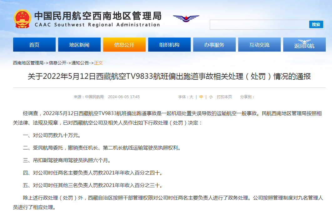5日,中国民用航空西南地区管理局网站发布《关于2022年5月12日西藏航空TV9833航班偏出跑道事故相关处理(处罚)情况的通报》,全文如下: