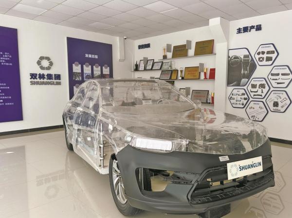 在双林股份的展厅,记者看到一辆透明的汽车模型,黑色部分则是代表其涉及的产品,主要包括汽车内外饰及精密零部件、智能控制系统部件、动力系统、轮毂轴承等。