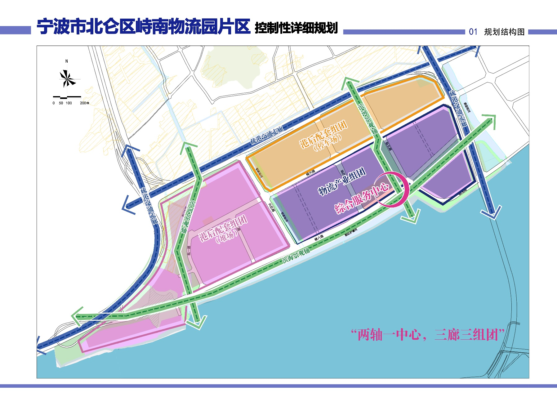 “三组团”为物流产业组团、港后配套组团(停车场)、港后配套组团(堆场)。