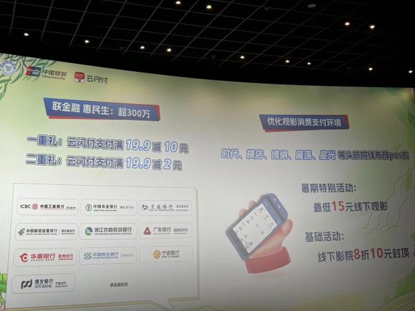 为有效促进金融助力电影消费,中国银联浙江分公司联合省内10余家金融机构,筹集超300万元资金,在淘票票APP上设置了“云闪付使用指定银行卡支付”满19.9元立减10元、满 19.9元立减2元等多重优惠活动。
